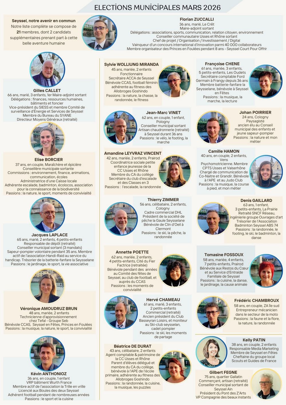 Notre liste rassemble 21 seysselans de tous horizons et de tous âges, actifs dans la vie associative ou professionnelle, et unis par une volonté commune de poursuivre le travail engagé autour de l’intérêt général. Elle réunit cinq élus sortants (dont deux maires-adjoints), un colistier déjà engagé en 2020, et de nouveaux profils aux compétences variées, dont deux candidats supplémentaires/remplaçants.